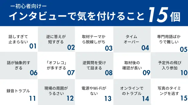 今回は、インタビュー中によくある「困った!」と、その解決策を15個まとめました。時間が足りない、話が脱線する、録音できていない……など、取材に慣れるまではヒヤヒヤする場面も多いですよね。事前に知っておけば、次の取材で落ち着いて対応できるはず!ぜひ、参考にしてみてください。