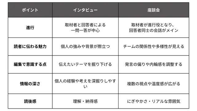 一対一のインタビューは、深掘りしながら話の流れを整理するのが一般的です。一方で座談会は、参加者が複数いるため、話題が広がりやすく、流れがゆるやかになります。違いを以下の表から見ていきます。