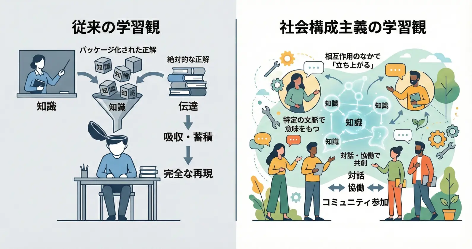 ▲「従来の学習観」と「社会構成主義の学習観」のイメージ