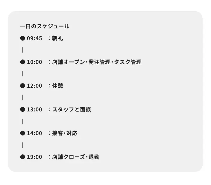 また、募集要項で勤務時間を理解していても「実際はどうなんだろう」と不安になる求職者も少なくありません。下記のように、1日の流れを時系列で紹介するのもおすすめです。