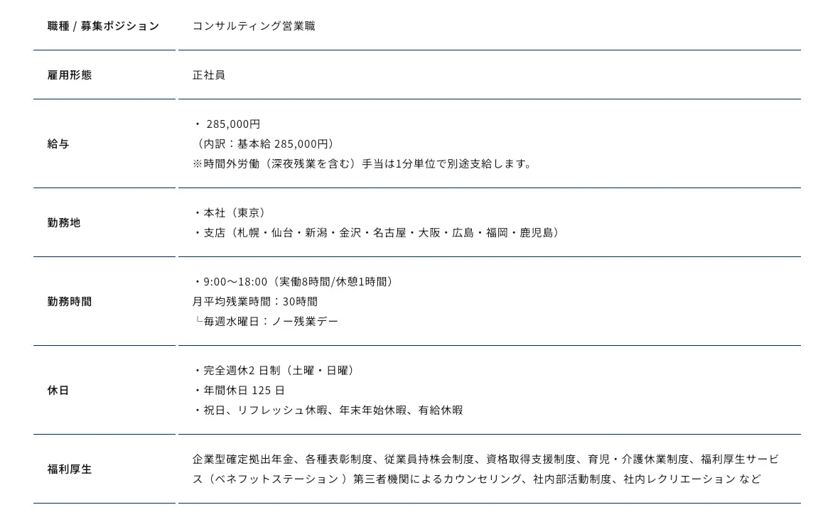 ライフワークバランスが重視されるなかで、福利厚生は求職者が重視する内容のひとつです。制度の一覧だけではなく、利用した社員の声なども掲載すると良いでしょう。