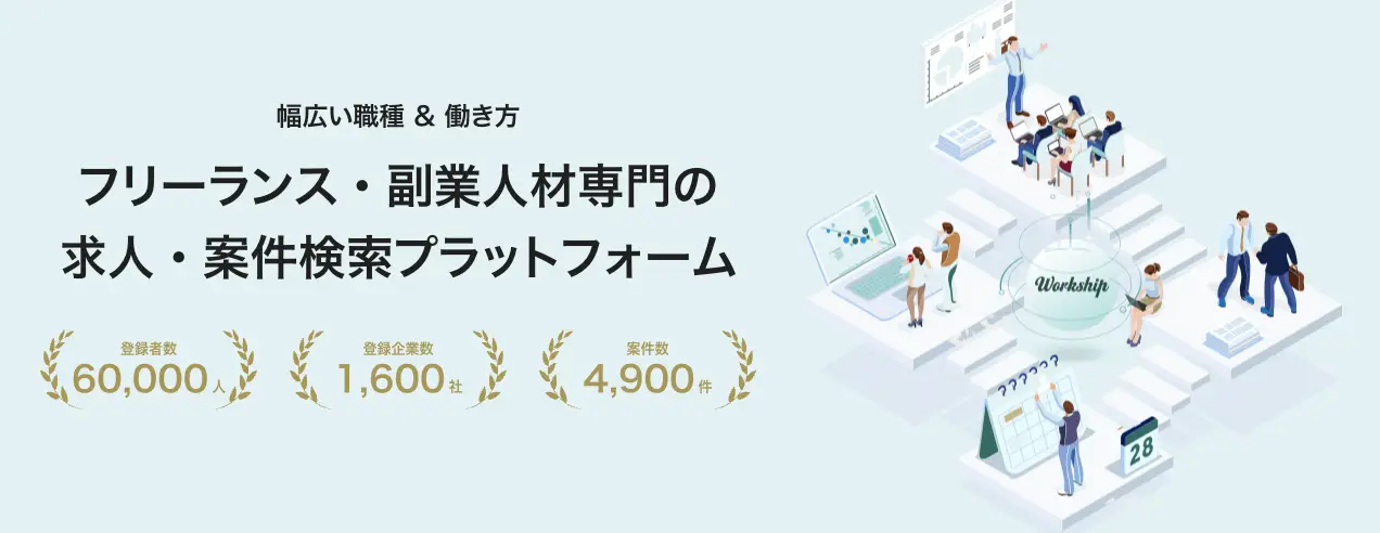 Workshipは当初、フリーランス専門サービスとしてスタートしましたが、社会的な副業推進の流れやご利用者様からのご要望にお応えし、副業人材も対象としたプラットフォームへと進化してまいりました。 現在では、案件探しから契約までを一気通貫で行えるプラットフォームとして、多くのフリーランス・副業ワーカーの皆様にご利用いただいております。