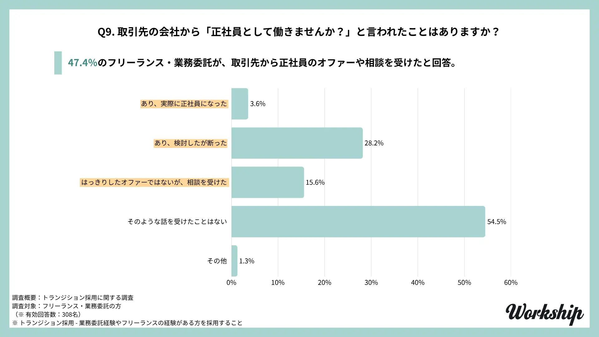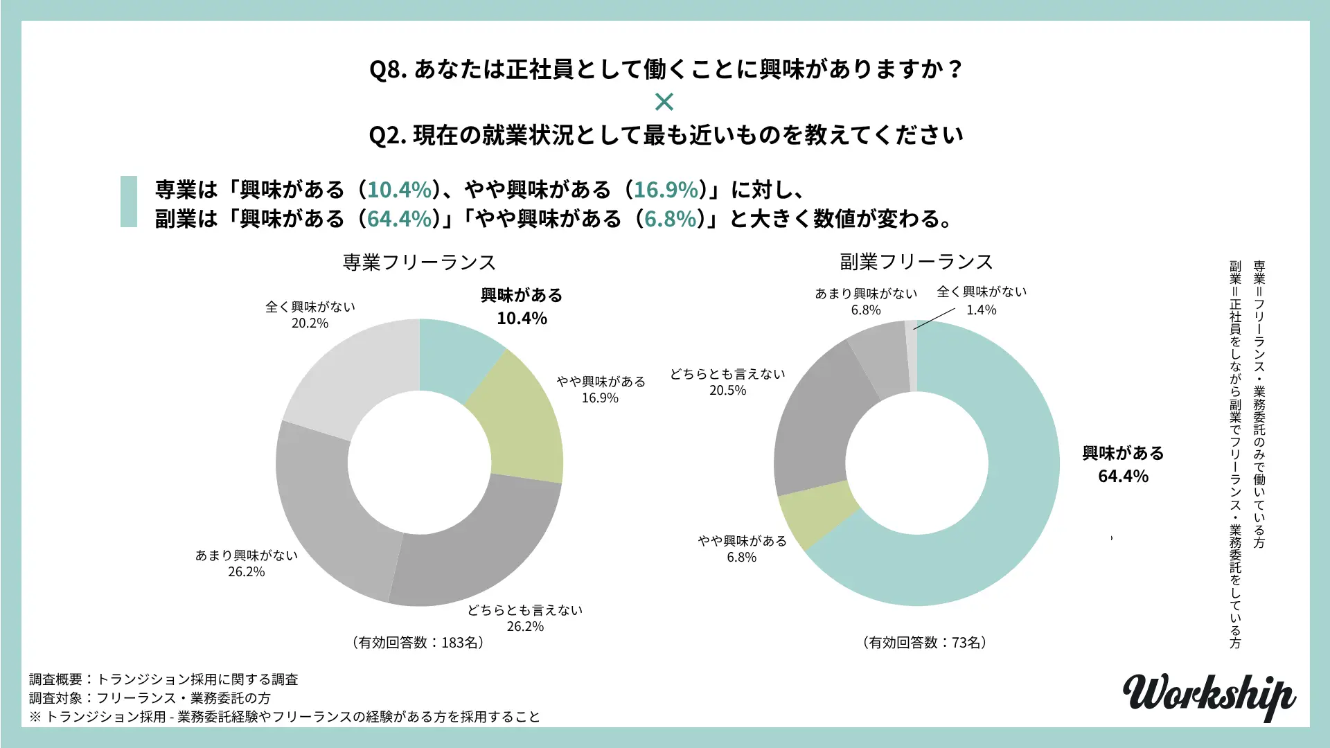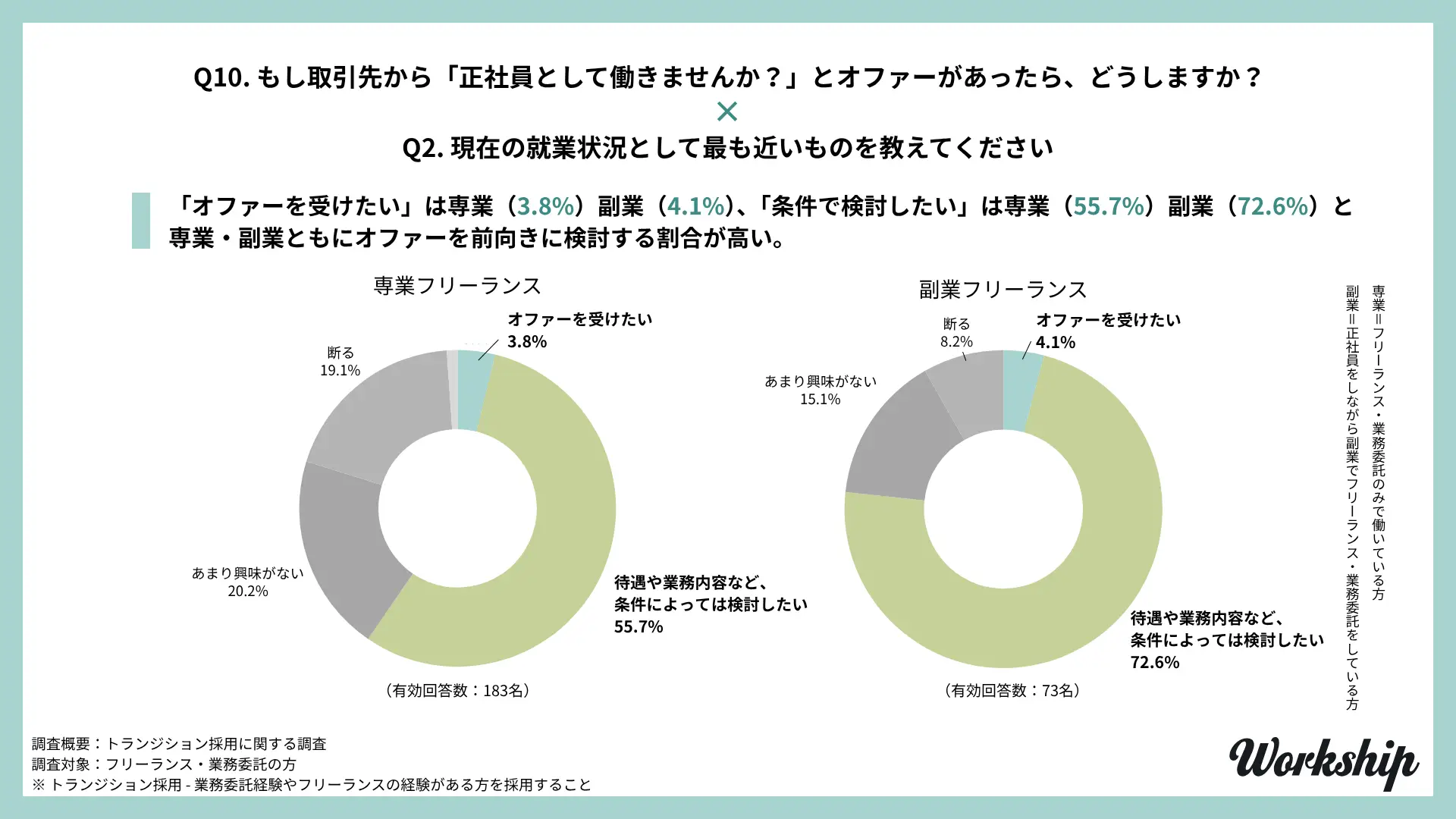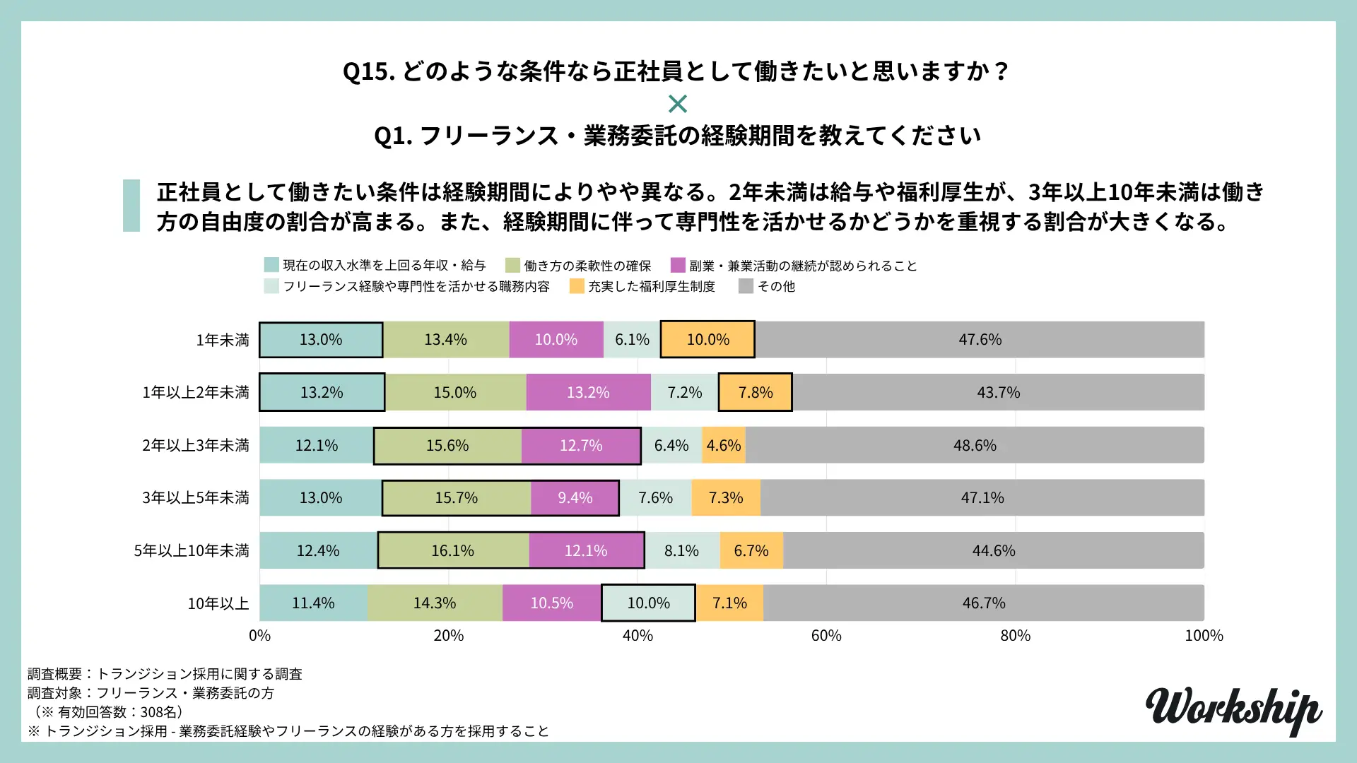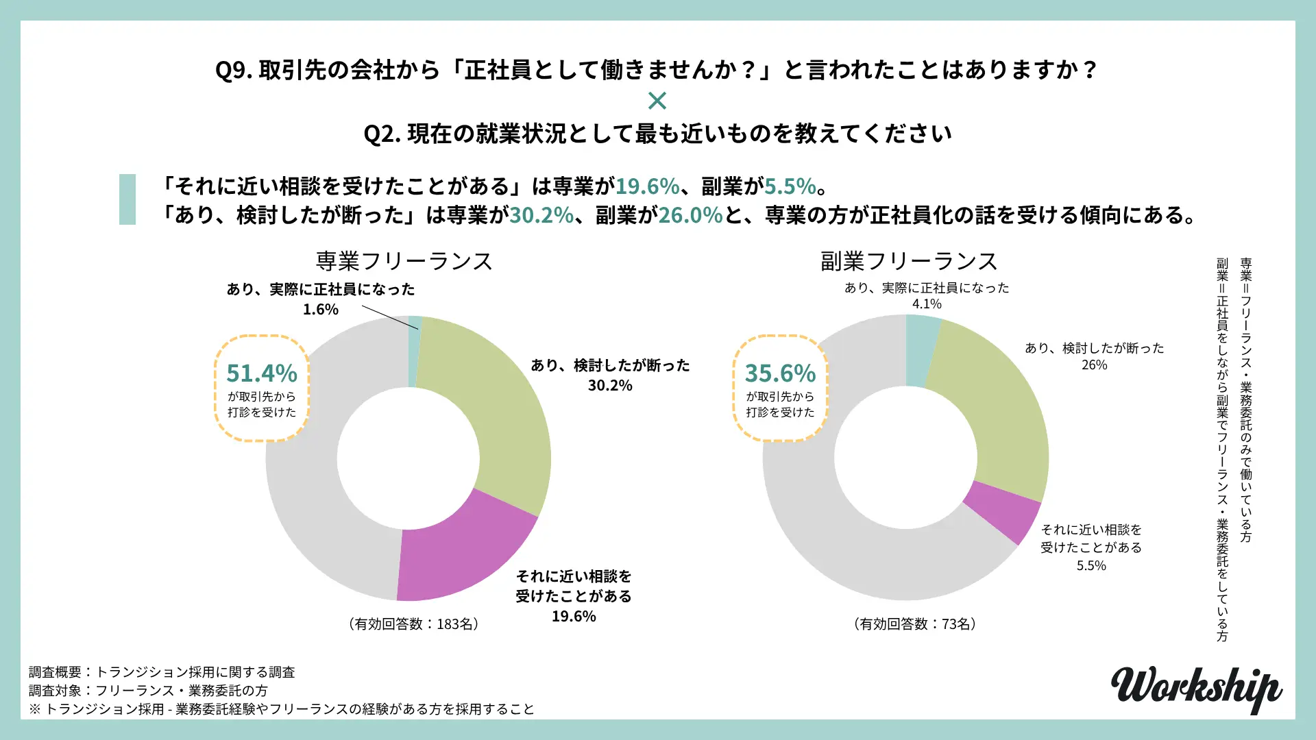 - 調査名:フリーランス・業務委託経験者を対象としたトランジション採用に関する調査(Workship / GIG)