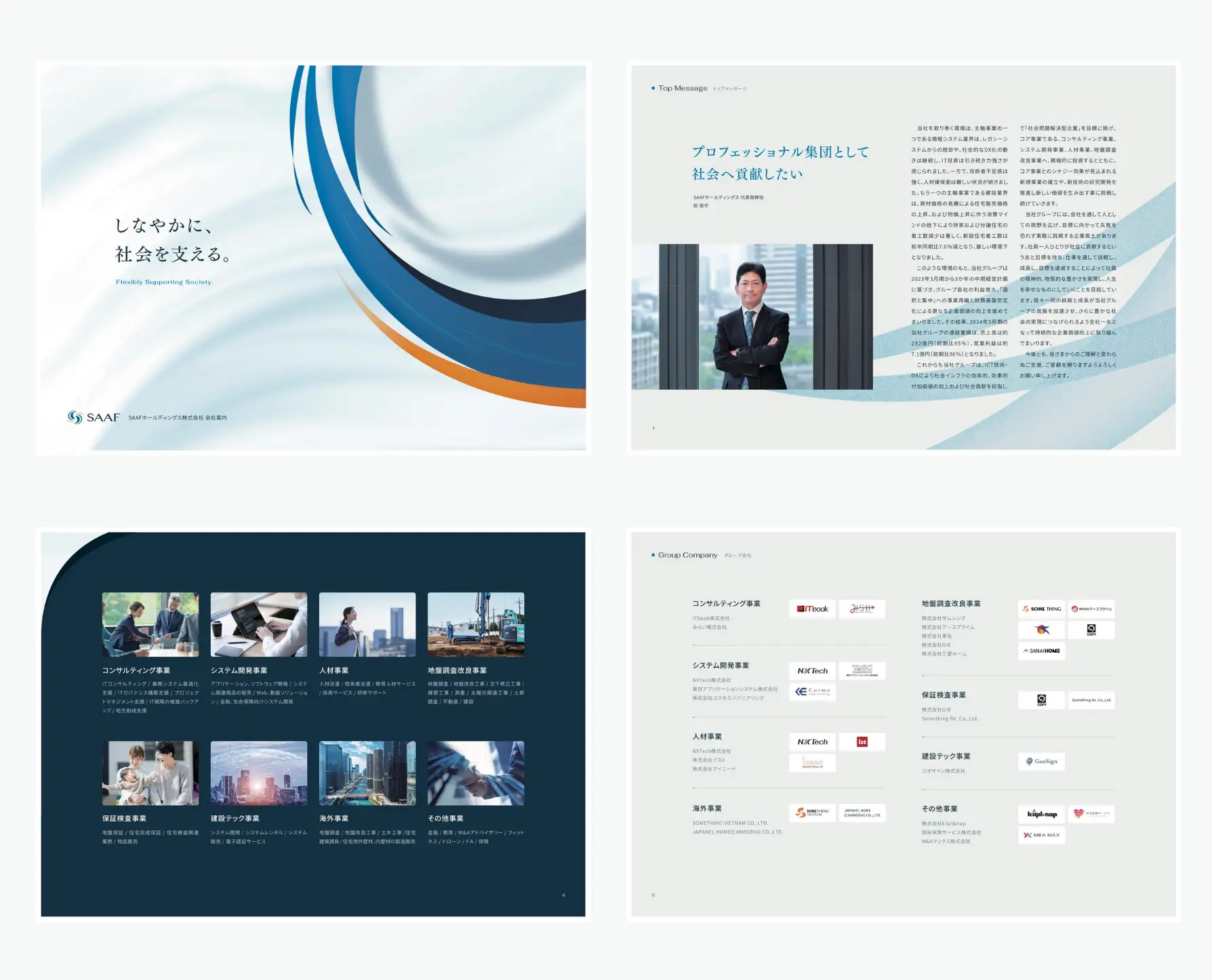 また、「コンサルティング」や「システム開発」「人材」「地盤調査改良」など、多岐にわたる事業展開を整理して掲載。多数のグループ会社が持つ専門性や対応領域の広さを一目で把握できるレイアウトにすることで、ホールディングス全体としての統一感を保ちつつ、グループ全体の総合力やスケール感を視覚的に表現したパンフレットに仕上げました。